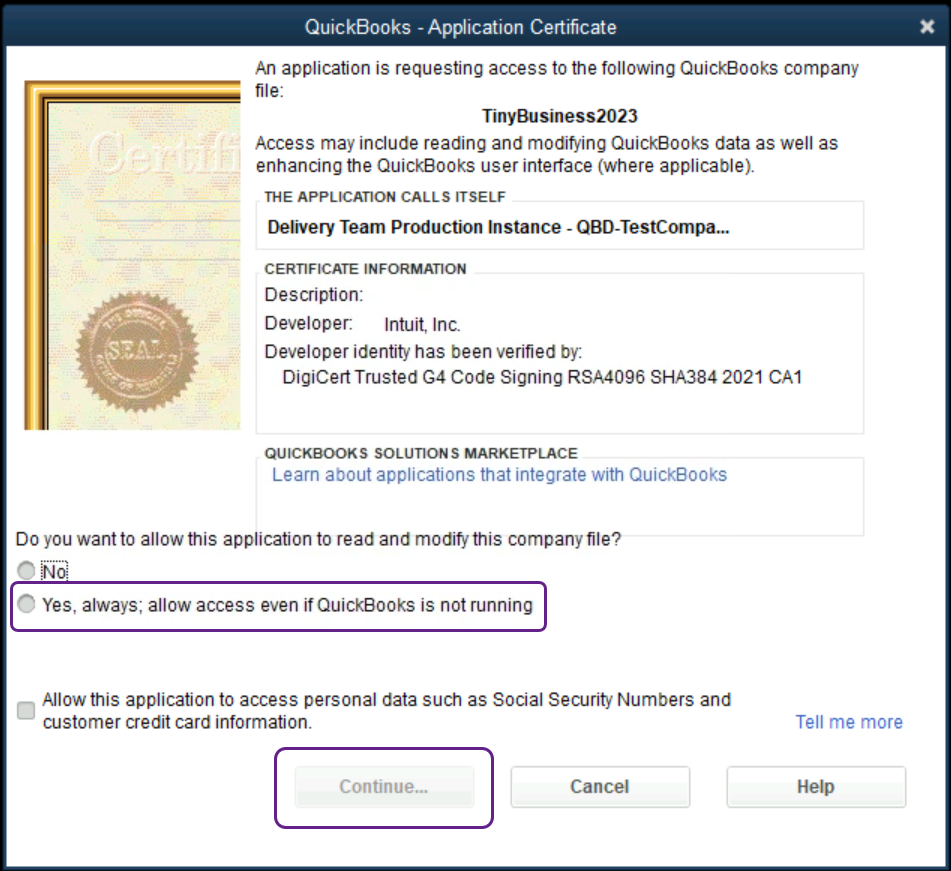 The user should select Yes, always; allow access even if QuickBooks is not running to enable the connector to work.